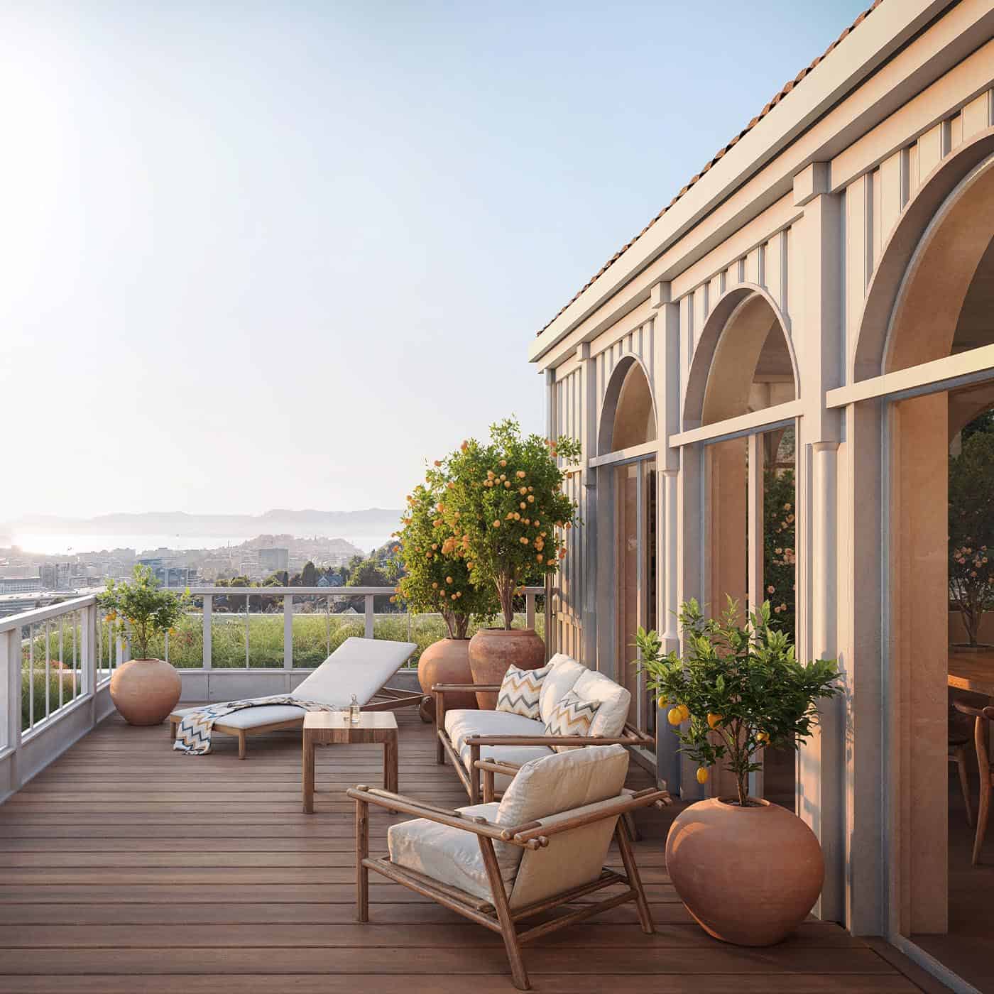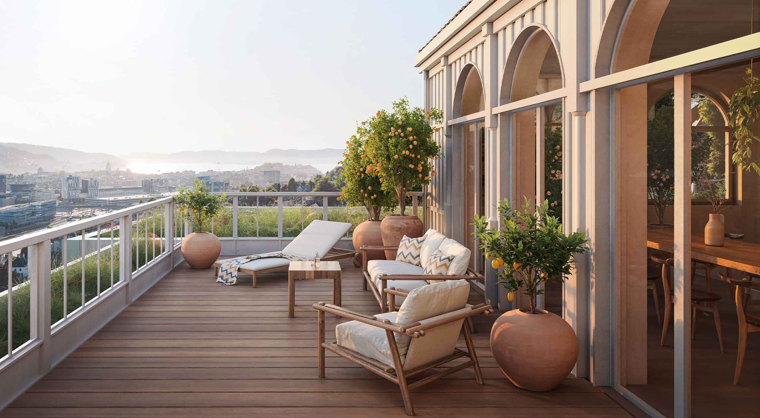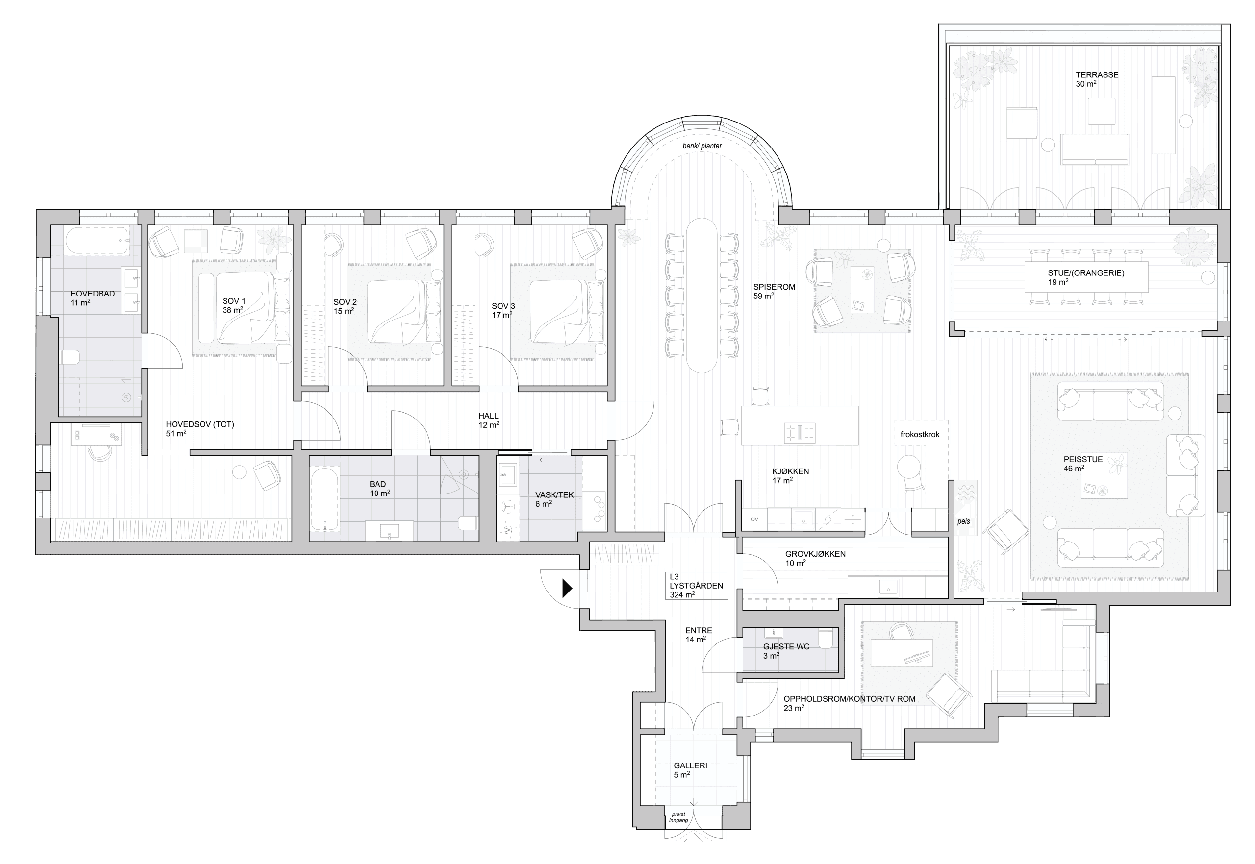 Terrassen vender mot øst, sør og vest, og forsterker opplevelsen av natur, lys og utsyn gjennom hele dagen. Leiligheten har egen privat, historisk inngang, og i tilknytning ligger muligheten for et tilbaketrukket arbeidsværelse.