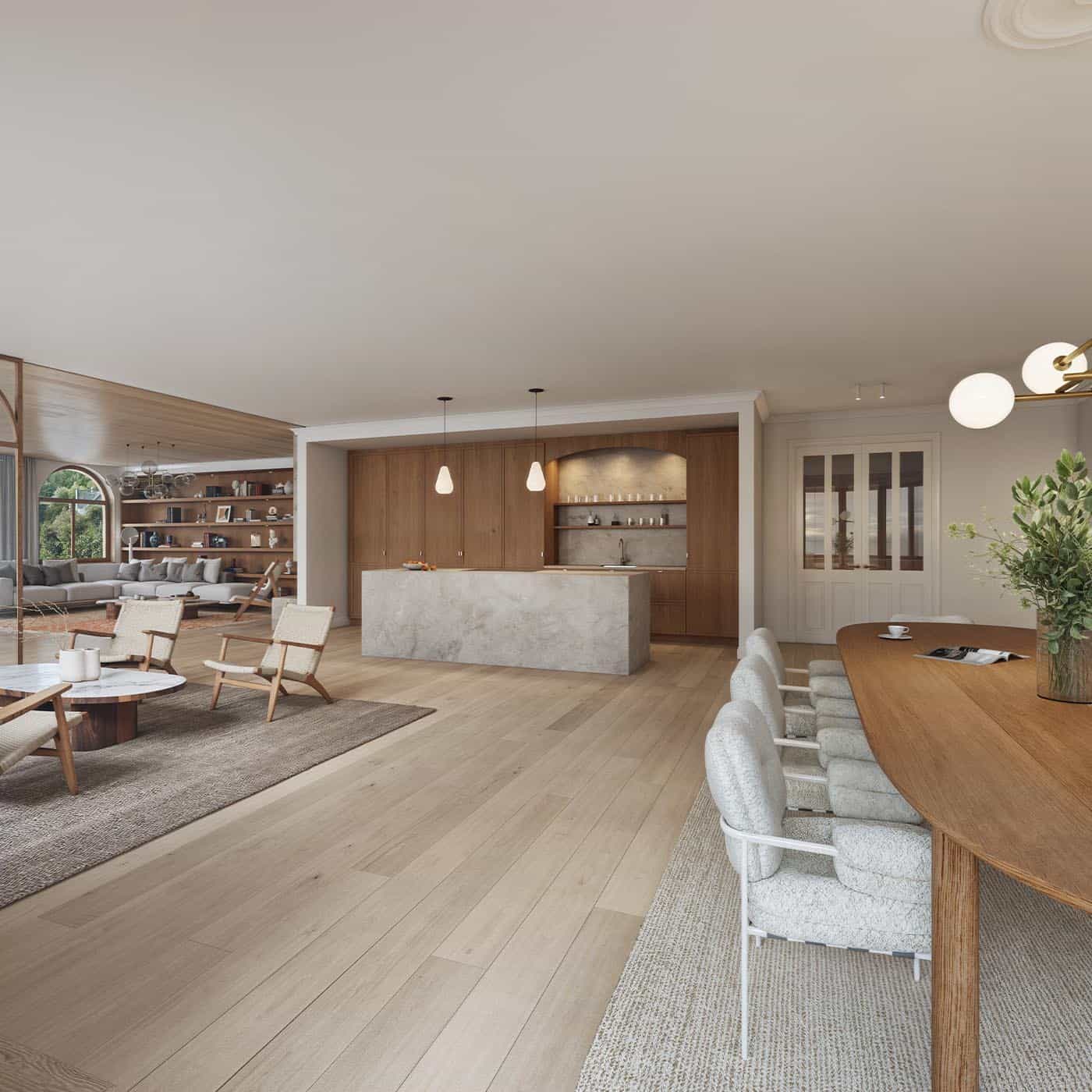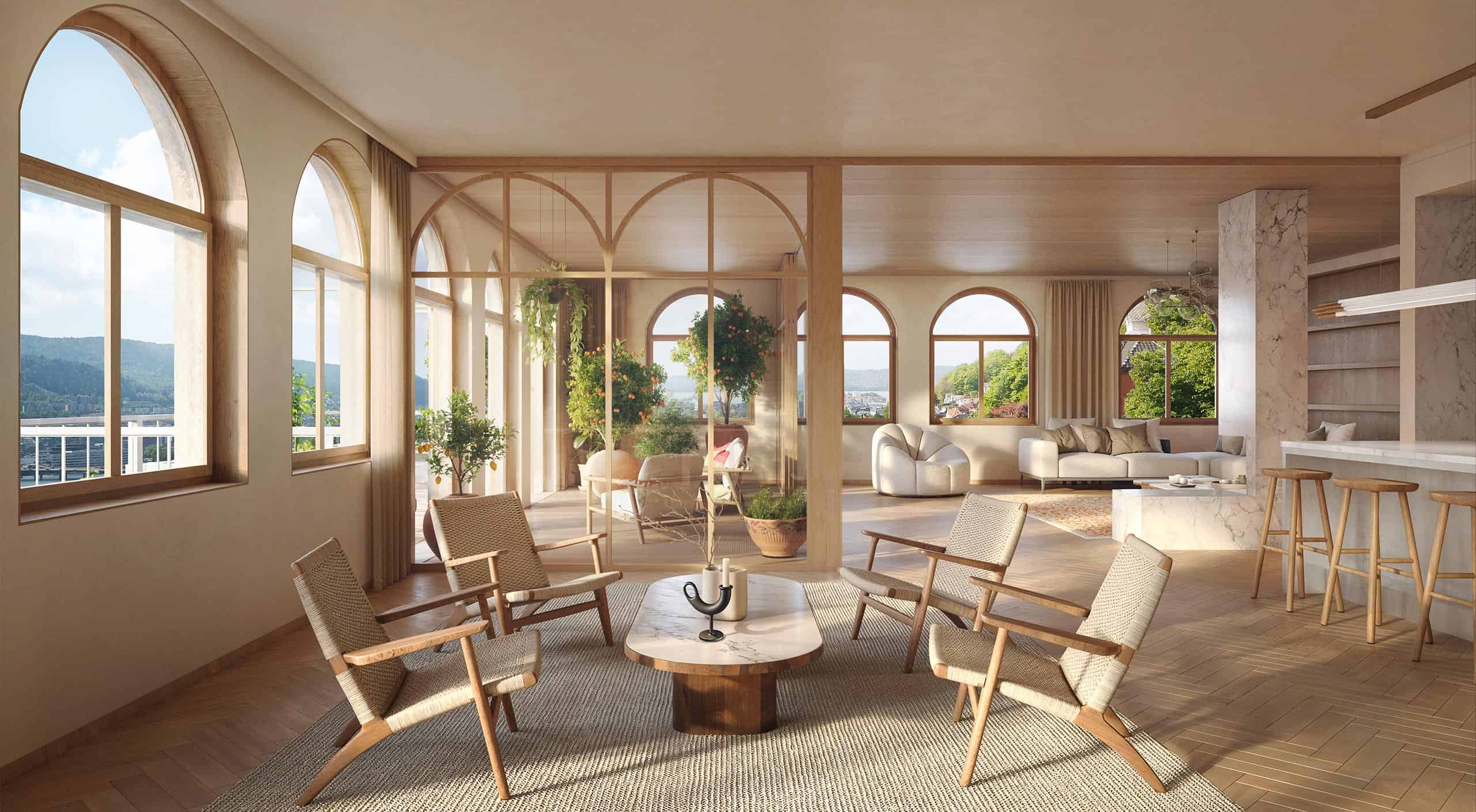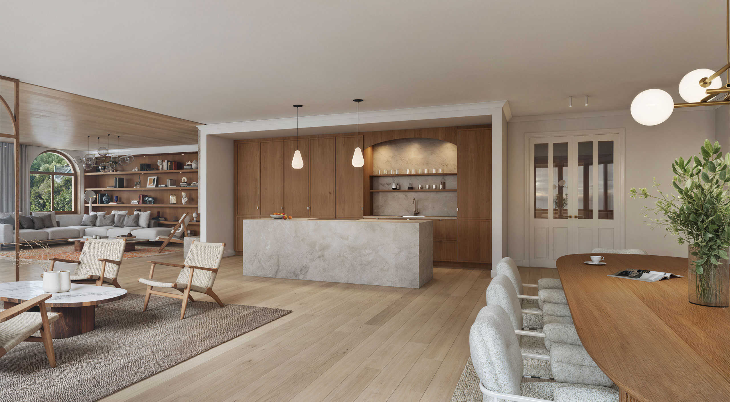 Soverommene er organisert som en rolig fløy med hovedsuite og generøse fasiliteter. En lang rekke storslåtte buevinduer gir leiligheten sin unike karakter og fyller rommene med et særpreget lys. Her oppleves utsikten som en del av interiøret.